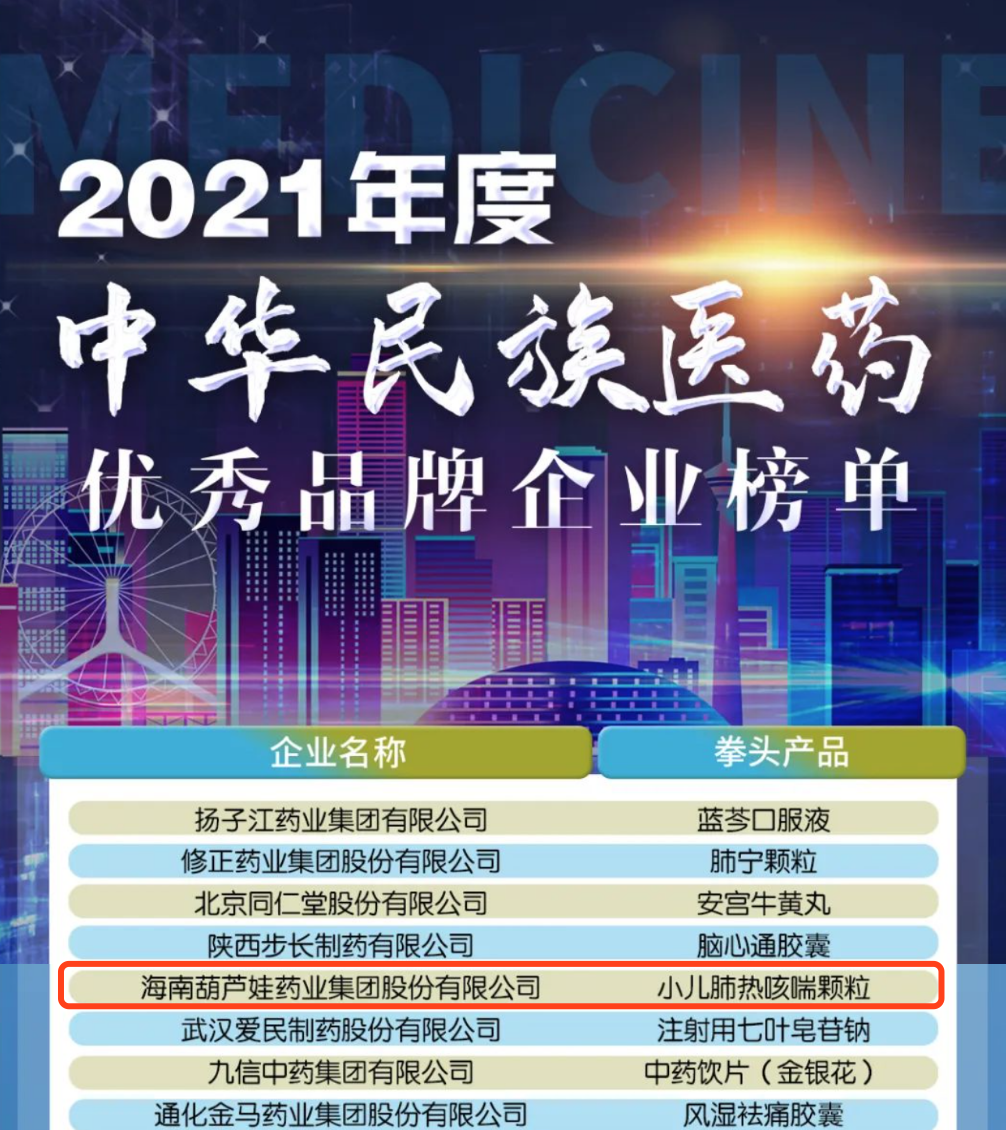 12月29日,全国工商联医药业商会发布了“2021年度中华民族医药优秀品牌企业榜单”,3522vip浦京集团药业集团凭借黄金单品小儿肺热咳喘颗粒(4克)实力登榜。